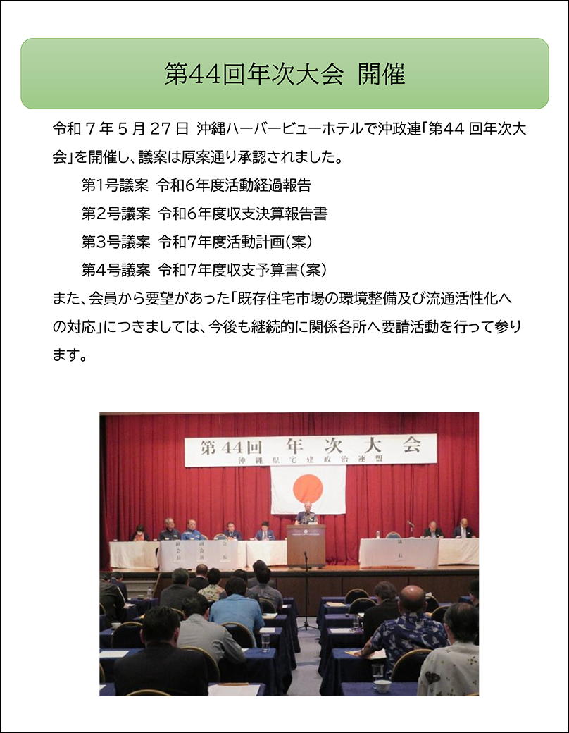 沖政連はこれまでに「土地住宅税制」「各種規制緩和」「会員業務支援」に関わる政策活動を行い、数々の成果を上げてきました。沖政連は今後も会員の切実な要望に耳を傾け、実現に向けて粘り強く活動していきます。